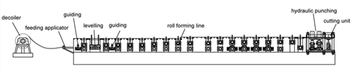 Decoiler -- feeding -- guiding -- leveling -- roll forming part -- hydraulic punching -- hydraulic cutting -- runout table